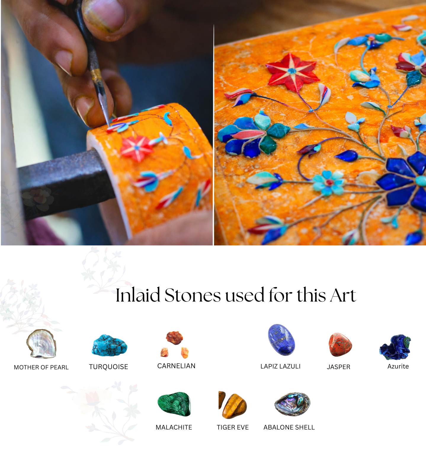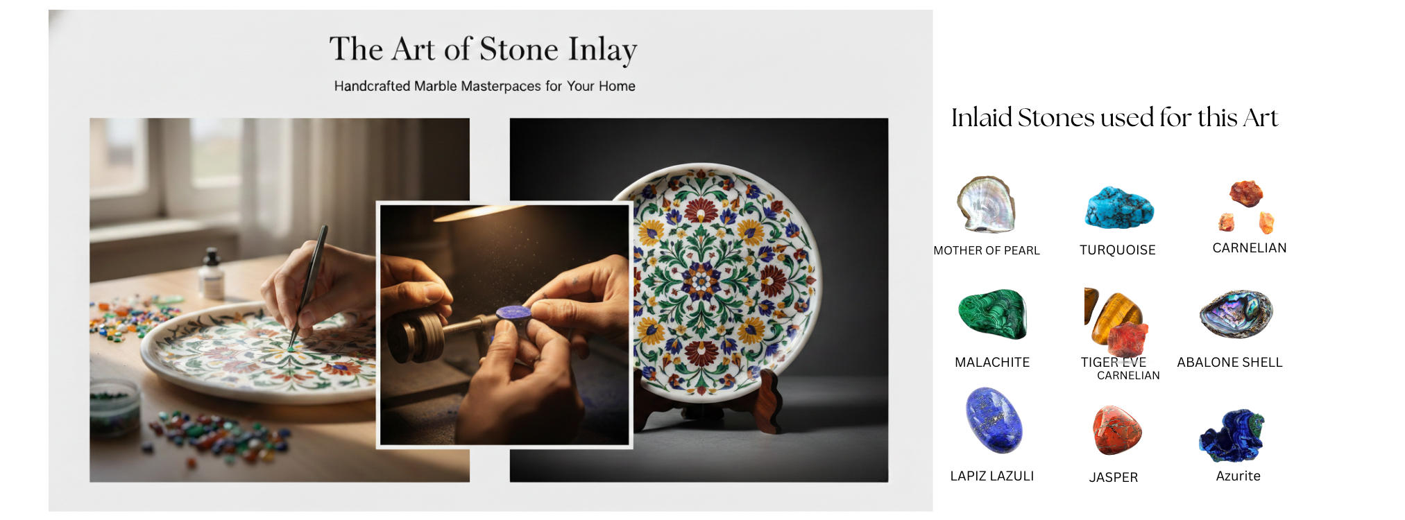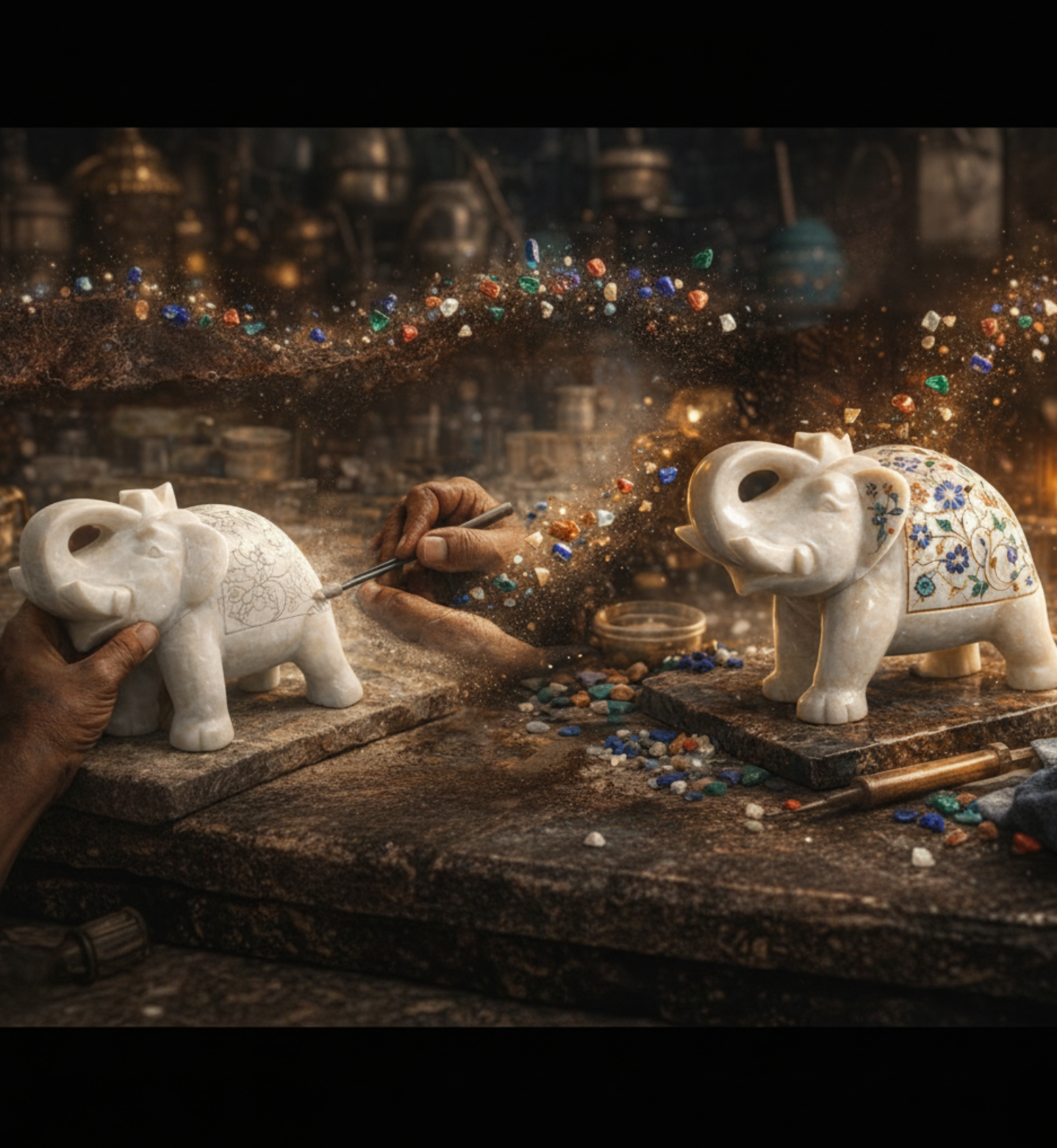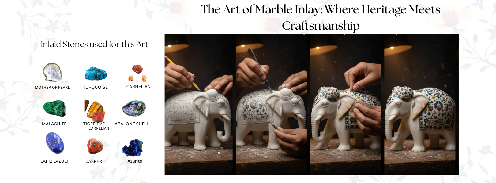 From raw marble to radiant art, this image captures a living tradition in motion. Skilled hands gently carve delicate floral patterns into pure marble, following designs inspired by royal Mughal heritage. Tiny pieces of semi-precious stones are shaped and set into these grooves like jewels finding their home. With careful polishing, dull stone awakens into vibrant color and graceful shine. What begins as a plain surface transforms into a story of patience, precision, and passion — where every curve holds history and every bloom is forever carved in stone.