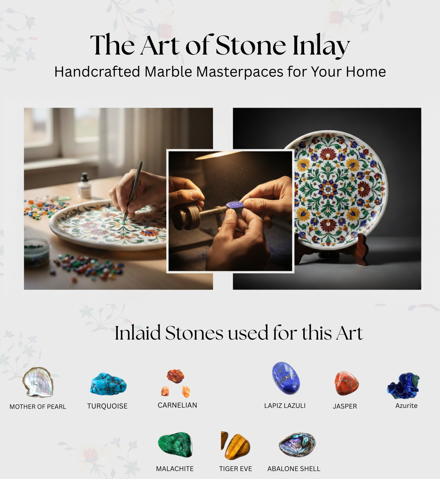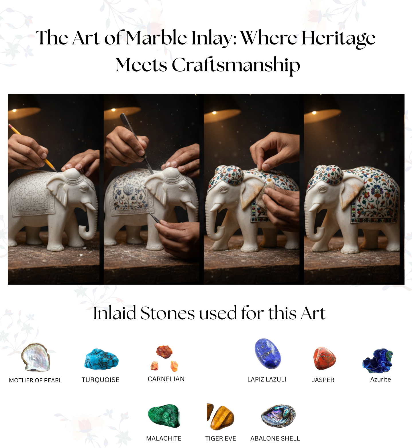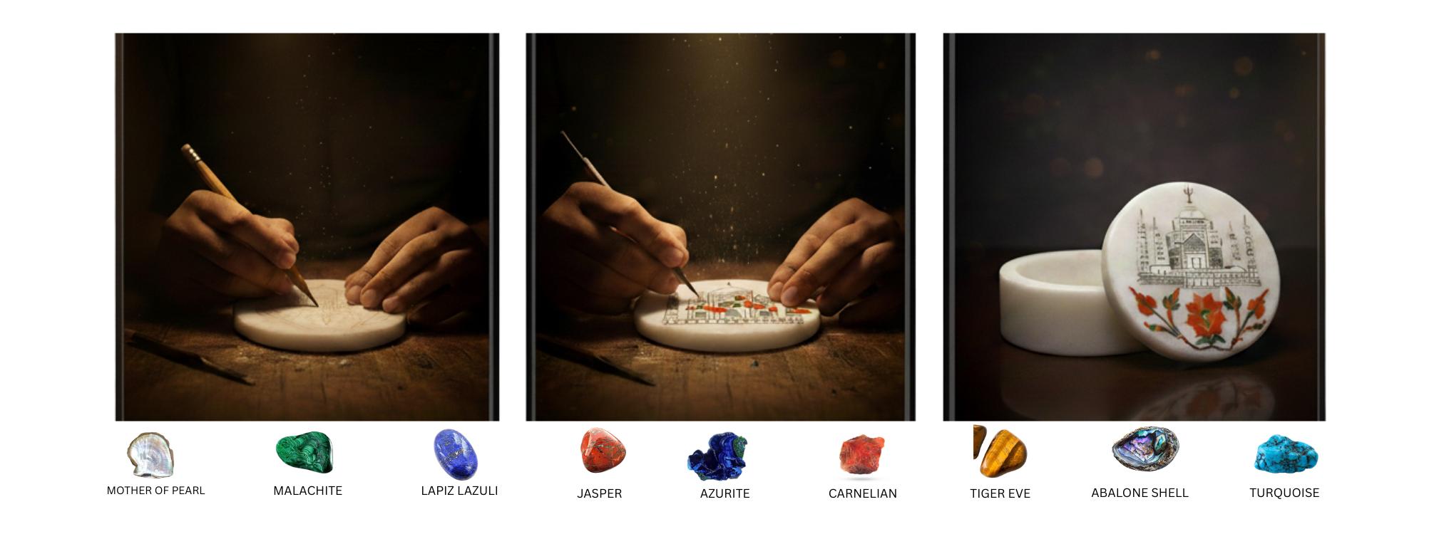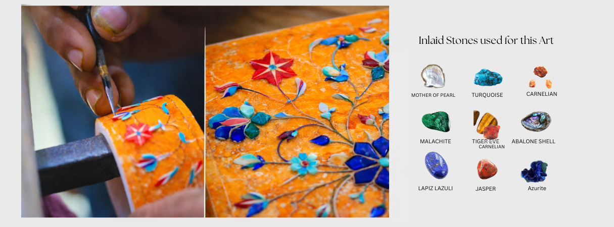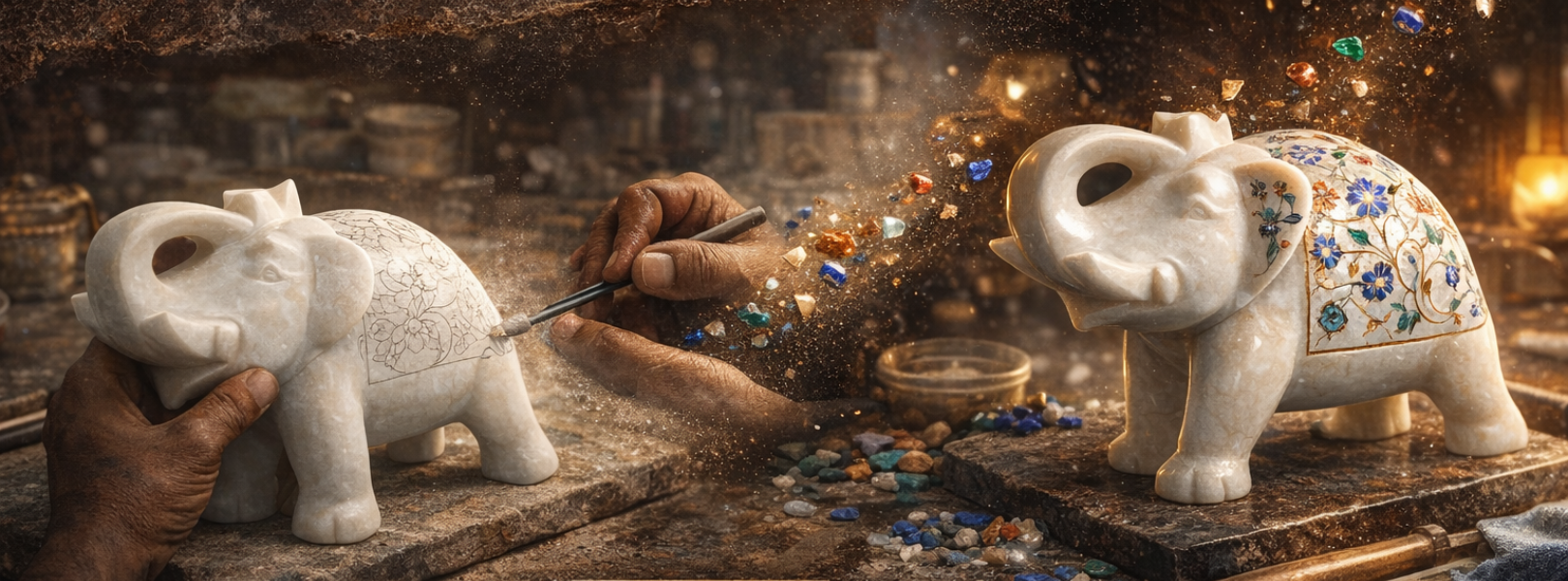 From raw marble to radiant art, this image captures a living tradition in motion. Skilled hands gently carve delicate floral patterns into pure marble, following designs inspired by royal Mughal heritage. Tiny pieces of semi-precious stones are shaped and set into these grooves like jewels finding their home. With careful polishing, dull stone awakens into vibrant color and graceful shine. What begins as a plain surface transforms into a story of patience, precision, and passion — where every curve holds history and every bloom is forever carved in stone.